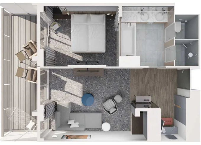 | JKCO - Junior Suite s balkónom C 26 m² + balkón 7 m² so stoličkami a podnožkami. 7. paluba. Max 4 osoby. Výhody Junior Suite. | 8 598 € 4 299 € za osobu | ||